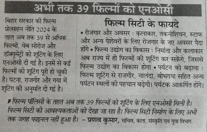 • Bihar Film City Update: 39 Shootings Approved Under Film Policy 2024