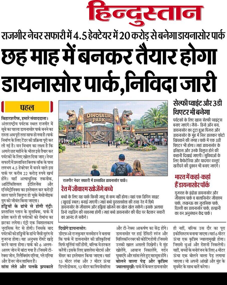खबर के अनुसार राजगीर में 4.5 हेक्टेयर में एक आधुनिक डायनासोर पार्क बनाया जा रहा है। इस पार्क में बड़े-बड़े (life-size) डायनासोर मॉडल लगाए जाएंगे, जो बिल्कुल असली जैसे दिखेंगे।